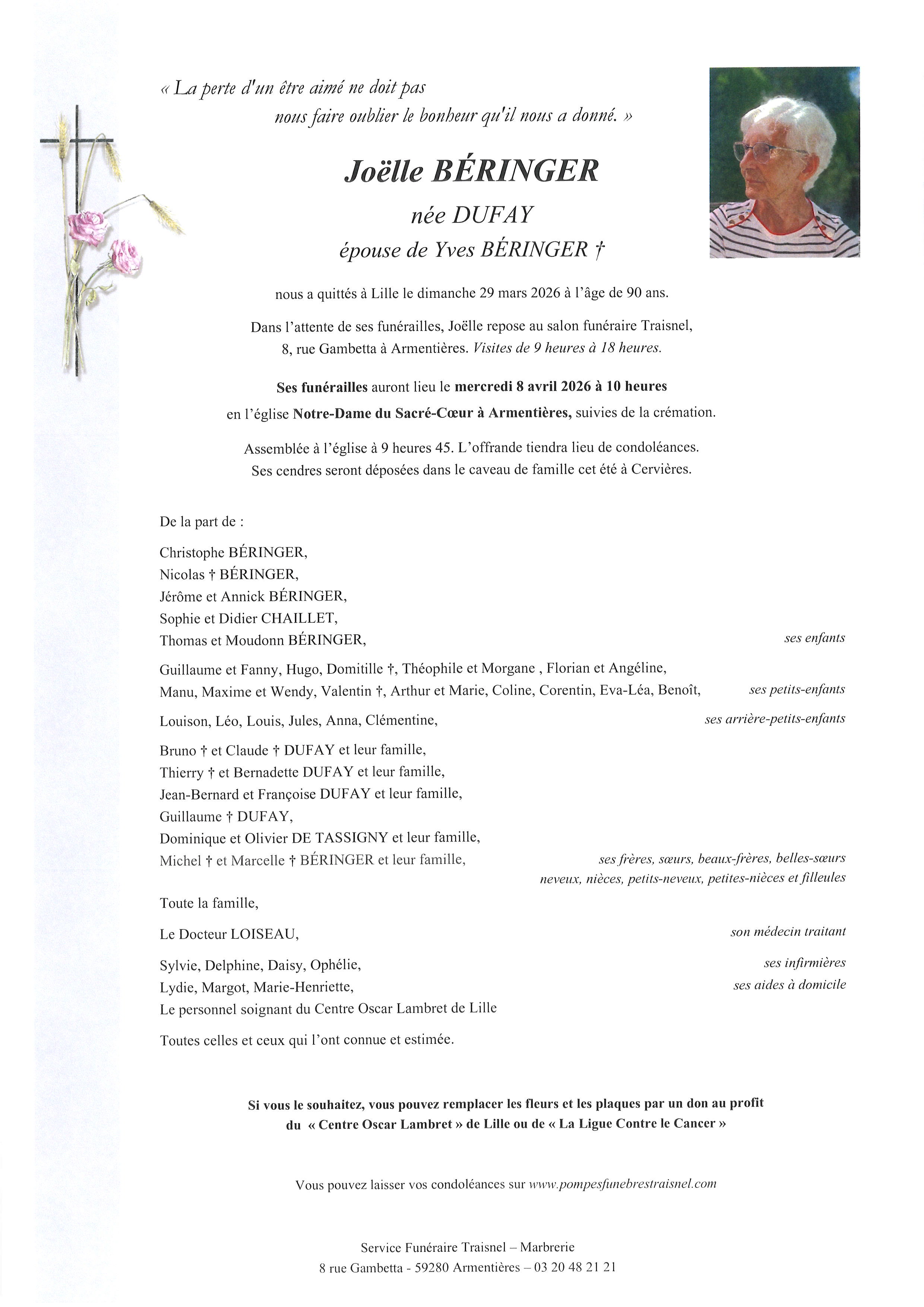 Avis de décès Traisnel Service Funéraire à Armentières